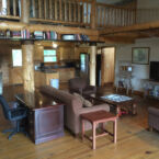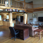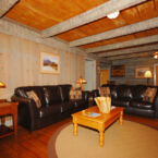 446 Log Cabin Great Room Vaulted Ceiling, all wood beams, timbers, and planking above, loft above has 3 queen beds and 2 sleeper sofas.