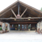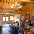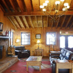 Lobby Great Room has Southern Pine Paneling, wood burning fireplace, business center, leather sofas.