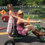 Playground with Big Wheel tricycles for adults, fenced & painted track for riding, yard games for all ages, and bicycle rentals!