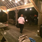 Wedding reception gone country with burlap runners, canning jars for flowers, and a camp fire at the old BBQ Pit.